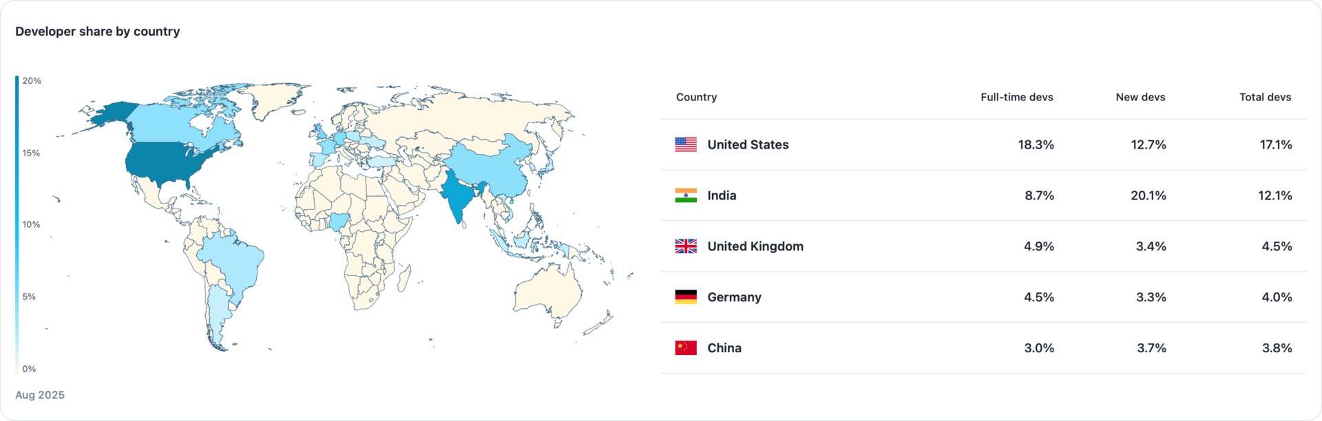 India onboarded the most new crypto developers in 2024. It has been the largest country for new crypto developers since 2023. The top three ecosystems adopted by active Indian developers are Solana, Ethereum, and Base.