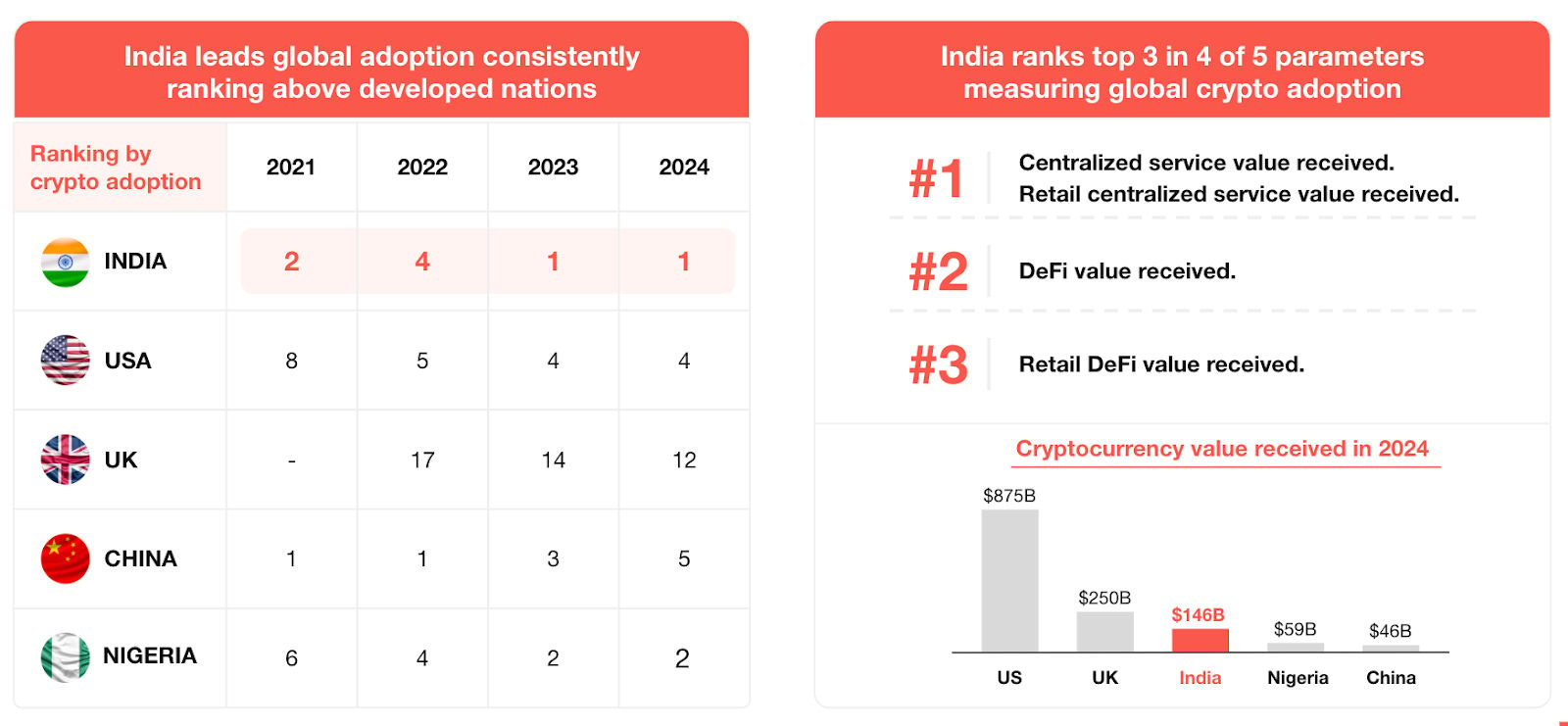India leads globally in grassroots crypto adoption for the second consecutive year, fueled by a youth tech-savvy population.