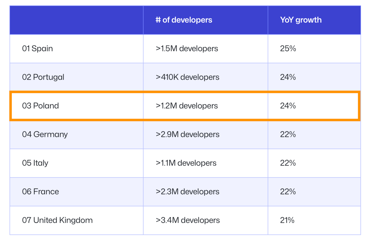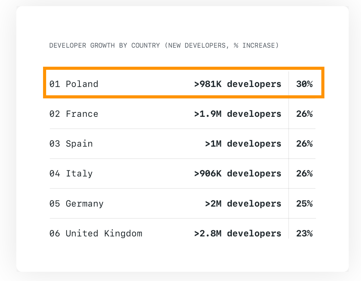 According to the 2022 Octoverse data, Poland led with over 981K new developers and a 30% increase. In 2023, the Octoverse data shows continued growth, with Poland contributing over 1.2M developers and a 24% year-over-year increase.