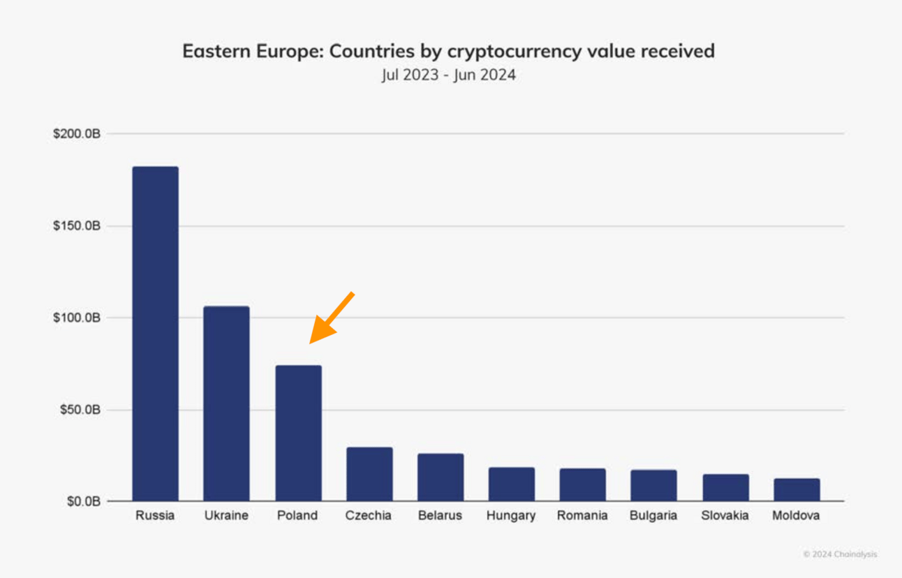 According to Chainalysis’ 2024 analysis, Poland ranks 24th globally in crypto adoption and is among the countries with the greatest cryptocurrency value received and DeFi growth in Eastern Europe, alongside Russia and Ukraine, particularly seeing significant growth in large institutional transfers.